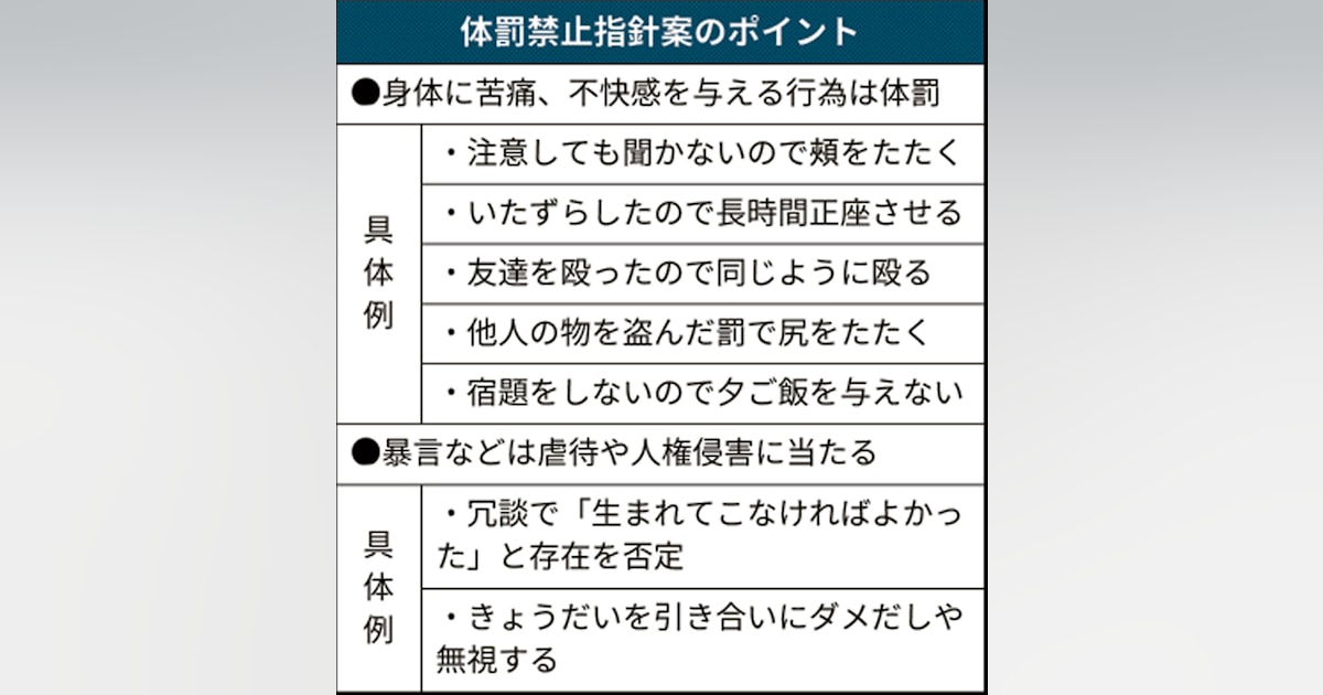 親の子供への体罰を禁止する改正児童虐待防止法が来春に施行されることを受け、厚生労働省は「どんなに軽い体罰も禁止」とする指針案をまとめた。体罰を「身体に苦痛、不快感を与える罰」と定義し、長時間の正座などを例示した。暴言なども子供の心を傷つける行為と位置づけ、体罰に代わるしつけの普及の必要性も強調。親以外も対象とするなど改正法より幅広く体罰を防止する。