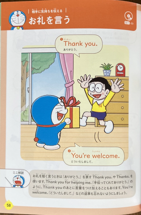 音声は付属のCDの他に、『ドラえもん はじめての英語辞典』と同様に「音声が聞けるページ」から再生ができます。